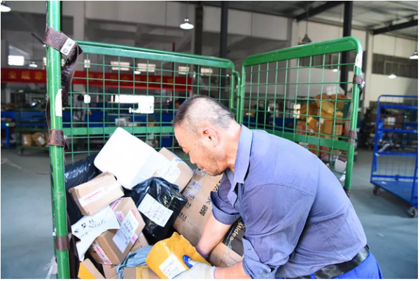 鋼結構的處理中心在烈日的炙烤下像一座巨大的烤箱,十幾個大功率電扇吹出的是一陣陣熱浪,配合著皮帶傳輸機的轟鳴,讓人多待一會都會覺得難受。為了保證時限,大大小小的包裹都得快速分揀,分揀員們的衣服以肉眼可見的速度被汗水浸透,工作強度非常大。“每天算上加班車,我們要處理13輛郵車的郵件,有時候量多一點會忙到晚上十點后。”轉運中心負責人程波告訴我們。