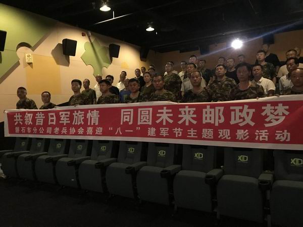 為慶祝中國人民解放軍建軍九十一周年,重溫艱苦奮斗的紅色歷史,共敘軍旅生涯的愛國情懷,8月1日,磐石市分公司開展以“共敘昔日軍旅情,同圓未來郵政夢”為主題的慶“八一”建軍節活動,組織了69名復轉軍人員工來到影院觀看電影《浴血廣昌》。通過本次活動,激發復轉軍人員工充分發揚吃苦在前、享樂在后的奉獻精神,面對經營發展的困難全力以赴,共同為磐石市分公司“再前再上、更富更強”的郵政夢而不懈奮斗。(吉林郵政工會)