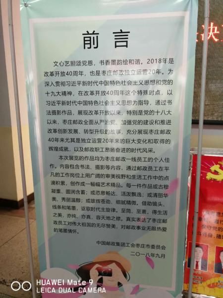 為深入貫徹習近平新時代中國特色社會主義思想和黨的十九大精神,在改革開放40周年這個特殊時點,棗莊市分公司舉辦慶祝“改革開放40周年”暨棗莊郵政獨立運營20周年書法攝影作品展覽活動。