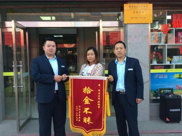 事情還要從9月15號說起,同溝寺支局開完晨會后,支局長陸曉華在營業廳做班前準備工作時,在填單臺下發現一個黃金手鏈。陸曉華立刻與全所人員商議如何尋找失主,大堂經理張皓然回憶說:昨天下午4點左右我打掃營業廳衛生時,填單臺下并未有手鏈,估計應該是臨下班時來辦理業務的用戶遺失的。通過調閱監控錄像并查閱了前一天的交易明細后,確定是前一天下午臨下班前來辦理業務的同溝寺鎮同溝寺村李翠丟失的。隨即支局長陸曉華和大堂經理張皓然兩人親自將黃金手鏈送到用戶李翠手中,李翠激動說:手鏈是上個月過生日時,老公送給自己的禮物,價值5000多元,丟了以后自己也很沮喪,沒有想到郵局又給自己送了回來,自己及其家人對同溝寺支局的工作人員非常感激,于是便有了開頭送錦旗的一幕。