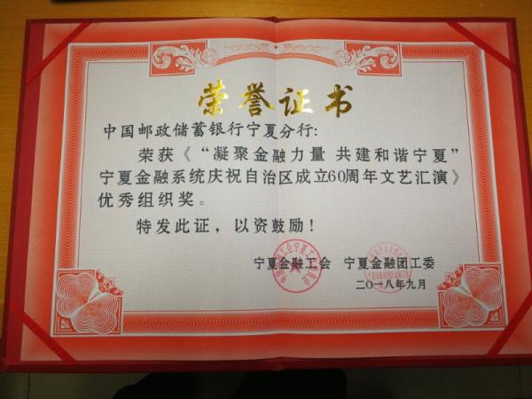 為慶祝自治區成立60周年暨建國69周年,推動寧夏金融系統職工群眾性文化活動的廣泛開展,豐富廣大職工業余文化生活,展示新時代寧夏金融職工的精神風貌。9月7日,寧夏金融工會、寧夏金融團工委舉辦了“凝聚金融力量 共建和諧寧夏”—寧夏金融系統慶祝自治區成立60周年暨迎國慶文藝匯演。此次文藝匯演共有31家單位38個節目參與,其中由寧夏區分行主辦,銀川市分行承辦的參演節目《不忘初心》,因主題突出,藝術感染力強,體現寧夏郵儲銀行員工忠誠擔當、愛崗敬業、團結奮進、不忘初心的精神風貌。在最終的綜合評審中脫穎而出,獲得三等獎和優秀組織獎的好成績。