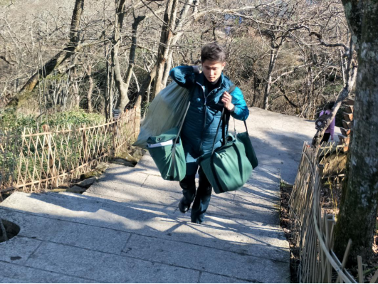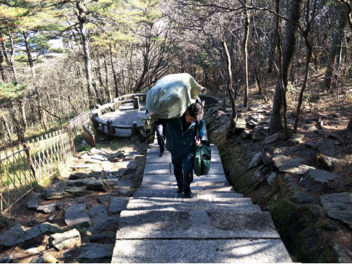 光明頂是黃山風景區第二大高峰,海拔1860米,黃山701臺、黃山氣象站就坐落在這里。從北海到光明頂的路程有1000多米,全是上行臺階,游步道上的游客到了光明頂都會越走越慢,氣喘吁吁,特別是冬季,臺階上結了薄冰,行走更加困難,不小心極易摔倒,謝菲俊每天都要負重近50公斤爬上去,把郵件安全送到用戶手中,三年來,他已磨壞了8雙運動鞋,個中艱辛可想而知。