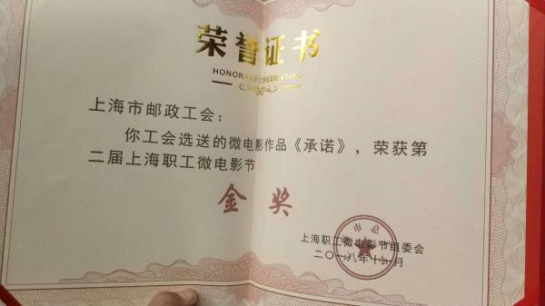 2018年11月30日,由上海市總工會主辦的“最美勞動者”第二屆上海市職工微電影節頒獎典禮在上海國際時尚中心舉行。上海郵政受邀參加紅毯儀式并出席頒獎禮。本次微電影節入圍影片數量創歷史新高,競爭激烈,佳片連連,所有獎項均在現場宣布結果。最終,上海郵政工會選送的《承諾》不負眾望,繼首屆微電影節后,再次奪得金獎!另獲最佳剪輯獎!為上海郵政獲得榮譽!