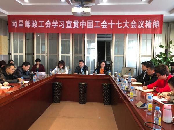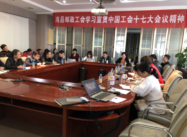 為深入學習宣傳貫徹習近平總書記重要講話精神和中國工會十七大精神,11月29日下午,南昌市郵政工會組織召開學習宣傳貫徹中國工會十七大精神專題會。市分公司副總經理、工會主席雷武高及各部門工會主席、專兼職工會干部共38人參加了專題學習會。