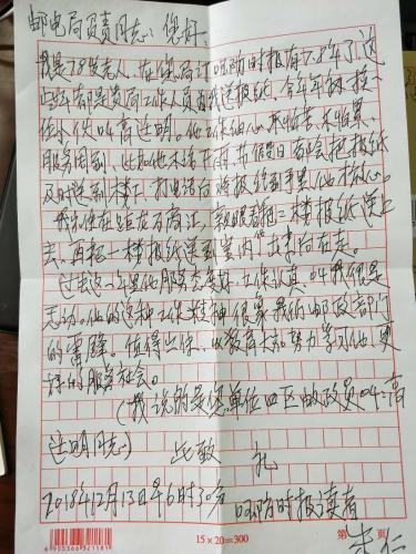 信中寫到老同志朱仁在郵政訂閱報刊已有七、八年,是《國防時報》的讀者,也是郵政忠實的老客戶。投遞員高廷明負責該老人所住片區的投遞服務工作,無論刮風下雨、風吹日曬、或是節假日,都能看到投遞員高廷明忙碌的身影。信中說到:投遞員每次投遞時都能親自把報刊交到老人手上,投遞員認真負責的工作態度是我們郵政企業的雷鋒精神。老人家提出要我們學習他的精神,更好的服務社會。高廷明同志用實際行動詮釋了“人民郵政為人民”的服務宗旨,用實際行動踐行著郵政人的職責與使命。