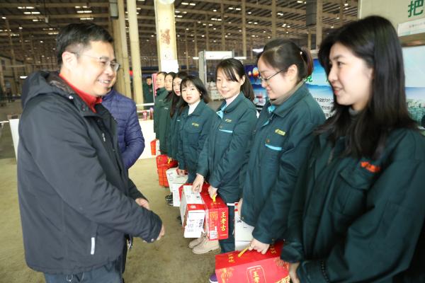 在郵件處理中心門口,丁永紅首先代表省分公司黨組向奮戰在節前旺季生產一線的員工以及省勞模致以節日的問候和衷心的感謝,并親手送上了節日慰問品。