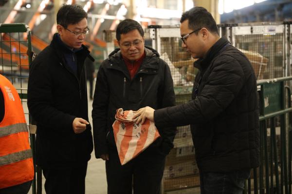 隨后,丁永紅來到郵件處理中心生產場地,詳細詢問了該局春節前旺季生產情況。在手工作業區,丁永紅詳細了解了手工處理情況,并饒有興致的拿起一件包裹仔細查看了郵件的收寄規格及信息,要求大家時刻牢記“以用戶為中心”,確保在春節來臨前能快速、準確、安全地將一件件包裹、一份份信函送達到用戶手中,不辜負用戶對郵政的信任。