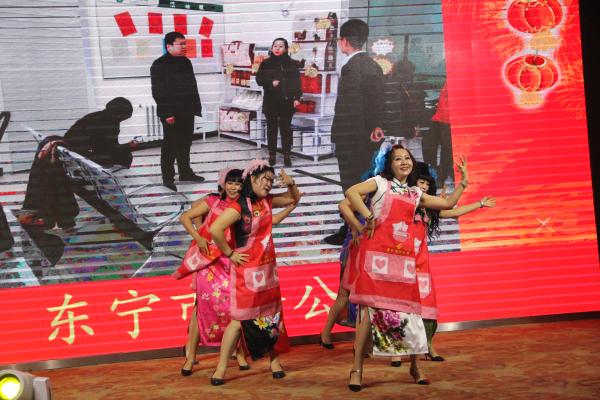 金融業務部為使節目達到預期效果,在日常工作量大,演出時間緊的情況下,幾次更改節目內容,最終確定以舞臺情景劇的形式反映“開門紅”期間一線職工“擼起袖子加油干”的場景。為使開場舞“開門紅”充分體現區分公司一線職工的干勁和熱情,市內四個區分公司分別抽調人員,利用晚上時間組織排練。雖然春節期間沒有休息,但參與排練的職工卻很是開心,充分激發了他們的內心熱情。市分公司機關中層干部為使“海草舞”達到柔美、夸張搞笑的效果,不惜犧牲個人時間,一遍遍對著鏡子進行練習,有些人還回家讓家人幫著糾正動作。市分公司機關的大合唱,最初排練人數達到了40多人,幾乎全部上場,后期由于晚會場地原因進行了減員,演出當天,看著臺上領導班子與職工共同演出,很多人還因為沒有上場感到遺憾。這一幕幕無比體現出了干部職工為這臺晚會所付出的辛勤和汗水,體現出了企業的凝聚力和向心力。