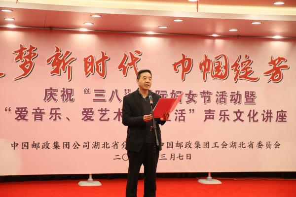 荊楚三月,春光明媚。3月7日下午,湖北省分公司舉行慶祝“三八”國際婦女節活動暨“愛音樂 愛藝術 愛生活”聲樂文化講座,表彰2018年度全省郵政企業女職工先進集體和優秀女職工,發起“讓閱讀成為一種生活方式”倡議,希望全省郵政女職工爭做知性修身的踐行者、企業發展的推動者和中華美德的傳承者。