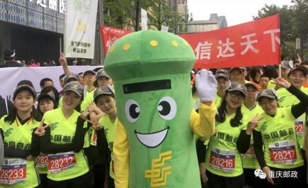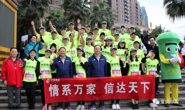 配合《馬拉松》特種郵票首發(fā),中國郵政集團(tuán)公司重慶市分公司專程組織了“跑團(tuán)方陣”參與“重馬”。來自部分市級(jí)部門(單位)、區(qū)縣分公司及市寄遞事業(yè)部的30名“跑馬”選手身著印有中國郵政LOGO的參賽制服,拉起“情系萬家、信達(dá)天下”的宣傳橫幅,帶上一只“郵筒”,成為賽場上一道亮麗的“綠色風(fēng)景”。 早上7點(diǎn),張榮林特意趕在比賽前慰問了重慶郵政參賽選手。當(dāng)?shù)弥蠹襾碜圆煌瑣徫?,且大多?shù)是優(yōu)秀共產(chǎn)黨員、先進(jìn)生產(chǎn)者、服務(wù)明星、“6+2”業(yè)務(wù)發(fā)展能手等時(shí),張榮林豎起大拇指為他們點(diǎn)贊。