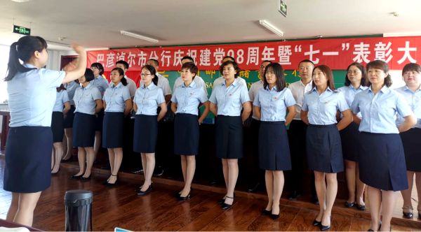 2019年7月1日,在雄偉的國歌聲中,巴彥淖爾市分行慶祝建黨98周年暨“七一”表彰大會(huì)拉開了帷幕。全體共產(chǎn)黨員面對(duì)黨旗莊嚴(yán)舉起右拳,再次重溫了入黨誓詞。