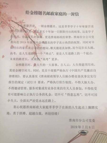 金秋好時分,金榜題名時,為切實表達對員工家庭的關心關懷,鼓勵金榜題名的郵政子女在企業的關愛下追逐夢想,展翅翱翔,根據安徽省郵政工會關愛員工指示精神,淮南市郵政分公司近日為20名員工子弟發放金秋助學金2萬元整,并為考入省內高校的郵政兒女送上傳遞親情的“兩城一箱”,為進入省外學府深造的淮郵青年寄去滿含濃情的“思鄉月”,市分公司黨委滿懷深情的寄出了《給金榜題名郵政家庭的一封信》,誠摯的送上殷殷祝福。