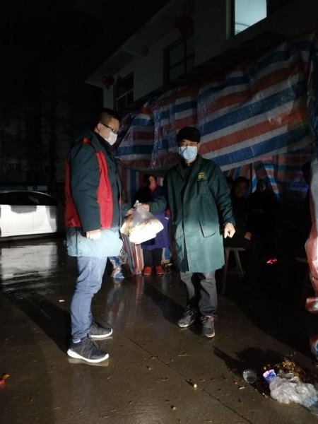 執勤點的晚餐,多是以面包或者泡面解決。冬天的夜晚格外寒冷,微暗的路燈下,余忠武堅守在執勤口上,用那已經凍的通紅、有些僵硬的手為零星往來的群眾登記和測量體溫。