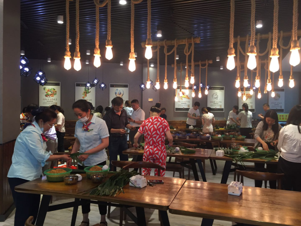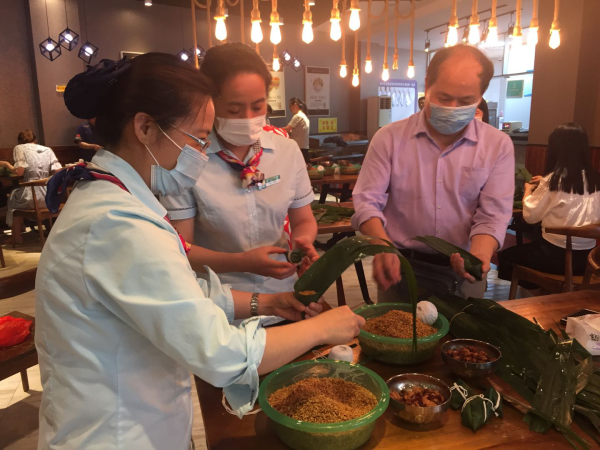 30余名員工齊上陣,將準備好的粽葉、糯米、紅豆、鮮肉、香腸、線繩等食材整齊地擺放在桌子上。高手們巧手翻飛,紛紛露出看家本領,三角粽、牛角粽、錐子粽,形態各異。新手積極學習如何包粽子、卷粽葉、放米、捆扎,談笑中大家體驗著制作美食的快樂。很快,一個個滿懷情誼的粽子包好了。 此次活動不僅豐富了個人文化生活,讓大家感受到了濃濃的節日氛圍,還增進了員工們的凝聚力和向心力,提升了工作活力。