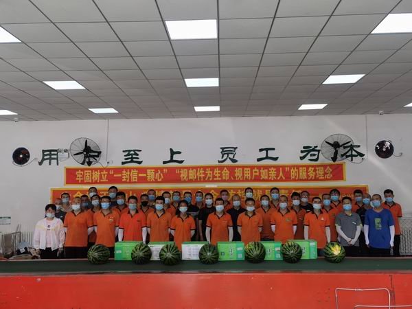 為切實做好夏季防暑降溫工作,維護高溫期間一線職工的身體健康,確保生產經營的順利進行,7月17日,磐石市分公司黨委書記王宇、工會主席岳剛、副總經理張連冠帶著冰絲袖、西瓜、綠茶等防暑降溫物品來到寄遞一線,為辛勤工作的員工帶去了一份問候,送去了一份清涼。