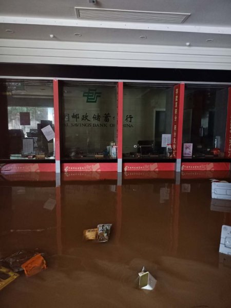 “希望洪水快點退去”,楊秀云站在二樓看著來勢兇猛的洪水,心里反復(fù)默念著。誰都能看出她的憂慮,因為近在咫尺的家中還有她兩個未成年的孩子,而且家中進水也淹至2米深了。她沒有選擇回家看一眼,而是堅守在網(wǎng)點,與網(wǎng)點員工共進退。