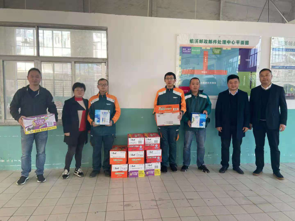 11月12日中午,宣城市分公司總經理胡煒、副總經理、工會主席李傳興放棄中午休息時間,帶領市郵政工會相關人員,親臨郵件處理中心,看望慰問“雙十一”期間堅守崗位,奮戰在一線的全體職工,為他們送去礦泉水、牛奶、方便面等慰問品,把市分公司黨委的關懷送到一線員工身邊。胡煒總經理叮囑郵運和投遞員注意行車安全,切實抓好旺季期間服務質量與安全生產兩項工作,確保“雙十一”期間投遞工作保質保量完成。