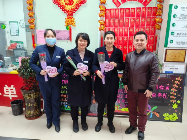 8日一大早,章貢區分公司總經理謝冬平和區分公司各部門的男同胞們,為節日期間堅守在工作崗位上的女職工們送上了鮮花和巧克力,送上了節日最美好的祝福和問候:感謝她們堅守在自己的崗位上,不分晝夜的辛勤付出,同時也祝福她們身體健康,闔家幸福,“三八節”快樂! (江西省郵政工會)
