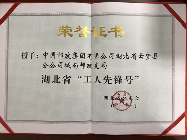 近期,云夢縣城南郵政支局被湖北省總工會授予2020年全省勞動競賽先進班組,同時授予“湖北省工人先鋒號”稱號。