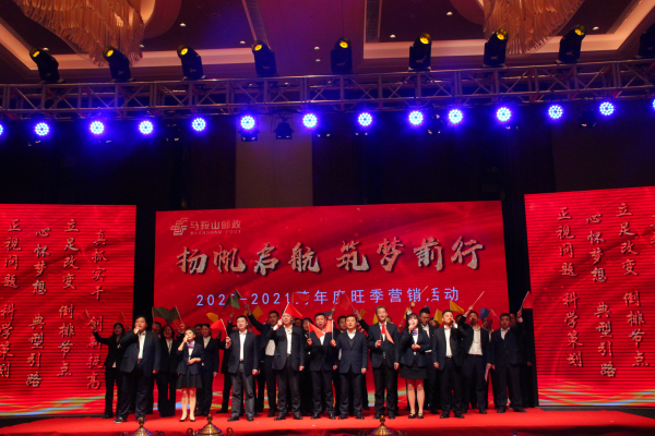 表彰晚會(huì)在市分公司工會(huì)編排的《戰(zhàn)鼓》中拉開本次大會(huì)的序幕,鼓樂聲聲響徹全場;和縣分會(huì)歌伴舞《超越夢想 郵政遠(yuǎn)航》詮釋了廣大員工跨賽以來所做出的不凡業(yè)績;機(jī)關(guān)工會(huì)配樂詩朗誦《致敬,我們心中的最美》從不同角度謳歌馬鞍山郵政人敢與拼搏的企業(yè)精神。之后萬頃總經(jīng)理首先從“不經(jīng)冬寒不知春暖”肯定了2020-2021旺季金融營銷活動(dòng)取得的來之不易的成果,奮斗汗水澆灌夢想之花;然后萬總從市場占有率、旺季點(diǎn)均余額及資產(chǎn)分析我們與同業(yè)機(jī)構(gòu)、與先進(jìn)單位之間的差距,指出馬鞍山郵政金融未來可期;提出征途漫漫,唯有不懈奮斗,始終以“干在實(shí)處 走在前列 科學(xué)發(fā)展”為工作指引,為早日實(shí)現(xiàn)馬鞍山市分公司余額規(guī)模200億目標(biāo),全體馬鞍山郵政人應(yīng)保持夢想在心,更須”快馬“加鞭!最后表彰大會(huì)在全場齊唱《明天會(huì)更好》中結(jié)束,以寓意著馬鞍山郵政員工們心系一條心,勁往一處使,以飽滿的熱情、堅(jiān)定的信心迎接美好的明天。