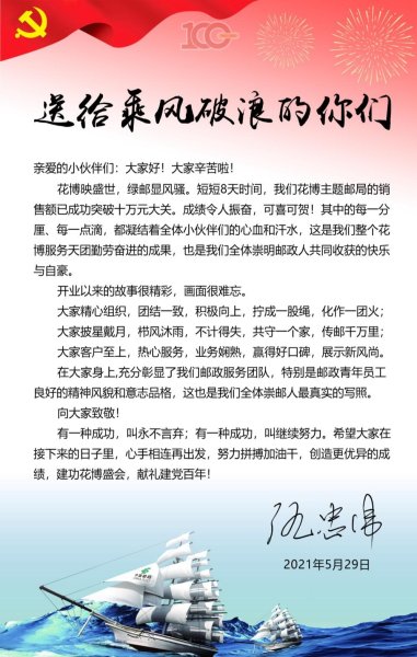 仇忠偉對主題郵局班組的各項服務工作表示充分肯定,他說:“在大家的身上充分彰顯了郵政服務團隊,特別是郵政青年員工良好的精神風貌和意志品格,這也是全體崇明郵政人最真實的寫照。”他要求,在接下來的日子里,班組的每一位成員要心手相連再出發,努力拼搏加油干,創造更優異的成績,建功花博會,獻禮建黨百年。(上海郵政工會)