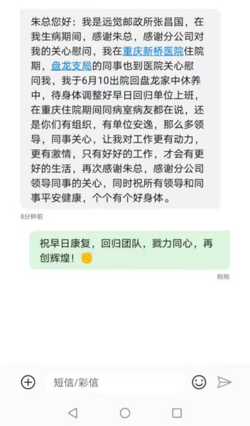 段靖首先向張昌國同志轉達了分公司領導的親切關懷,得知他患病后分公司非常關心,并叮囑鼓勵他不要灰心氣餒,要堅定信心積極治療。隨后,段靖代表分公司為張昌國送去了慰問金,表示每一名職工都是榮昌郵政大家庭的重要一份子,希望張昌國同志早日恢復健康。張昌國衷心的感謝分公司和領導、同事們對他的關心。他表示,大家的關愛讓他和家人增強了與病魔抗爭的勇氣,他一定會以堅強的意志、樂觀的心態,積極進行康復治療,爭取早日重返工作崗位,為企業發展貢獻自己的力量。