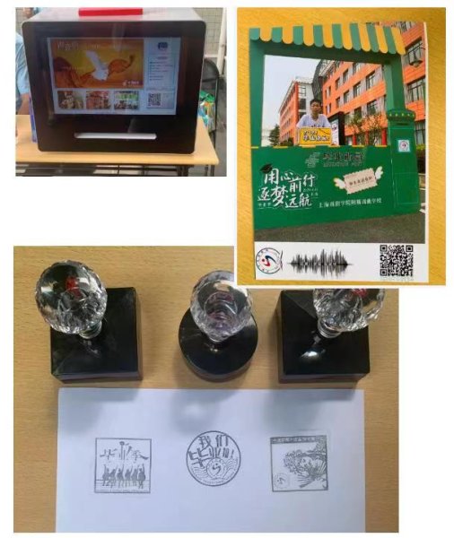 上海郵政閔行區分公司的駐點工作人員忙碌地指導每一位在場畢業生們制作自己的專屬有聲明信片,從上傳照片、留聲、到拿到成品,不出短短幾分鐘,一張屬于畢業生的專屬個性化郵資明信片就打印完成了,蓋上定制紀念郵戳,寫一封時光郵件,投入郵筒,寄往未來,格外具有紀念意義。