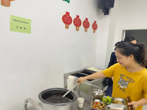 為提升夏季呼吸道傳染預防效果,九龍坡區分公司鼓勵員工加強體育鍛煉、做好日常防護的同時,也積極采取“內部調理”預防措施。根據九龍坡區新型冠狀病毒肺炎疫情防控工作領導小組發布推薦的中醫藥預防處方,九龍坡工會積極組織采買、煎煮、送飲。8月12日,區分公司食堂迎來了首日呼吸道傳染預防中藥飲品,藥味十足的餐廳彌漫的是健康的味道,廣大員工積極取用,紛紛點贊區分公司的這波福利,表示一定好好吃藥、好好鍛煉,認真做好呼吸道傳染各項預防工作。