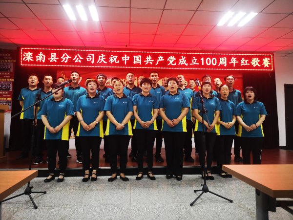 灤南縣郵政分公司內燈火輝煌、紅旗招展、歌聲嘹亮,灤南縣分公司11支參賽隊伍,用一首首紅色經典歌曲,贊美建黨100周年的輝煌成就,唱出對祖國明天的美好祝福。