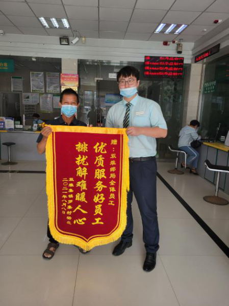 據(jù)悉楊大哥的母親前些日子因病去世,近期來辦理提取已故存款人小額存款業(yè)務(wù),網(wǎng)點營業(yè)員石震坤在了解后,一方面予以暖心安慰,一方面積極辦理相關(guān)業(yè)務(wù)。由于業(yè)務(wù)比較復雜、辦理時間較長,為照顧楊大哥的情緒,在為其辦理業(yè)務(wù)的同時還時不時與其聊天給其講解業(yè)務(wù)流程安撫其等待的焦躁情緒,最終成功幫其辦理此業(yè)務(wù)。 楊大哥十分寬慰,為雙堆網(wǎng)點員工溫暖耐心、細致入微的服務(wù)而感動,為郵政銀行如此貼心又專業(yè)的服務(wù)動容,特此送來這面錦旗表達感謝。