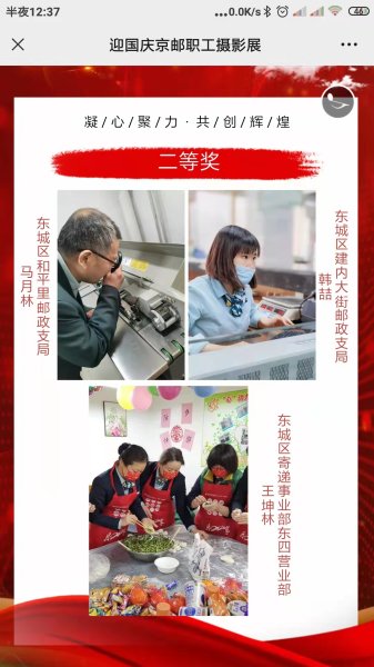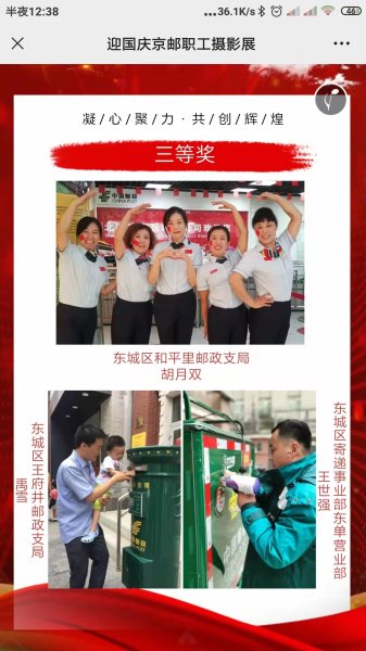 在喜迎新中國成立72周年之際,北京郵政工會舉辦迎國慶京郵職工隨手拍攝影作品展示活動。經(jīng)過精心準(zhǔn)備、設(shè)計排版,10月1日,活動正式在“郵會通”微信公眾號進(jìn)行展示。攝影作品均為2021年“迎建黨百年,展郵政風(fēng)采”全國郵政職工隨手拍設(shè)計大賽中北京郵政職工一、二、三等獎獲獎作品。