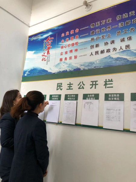 滁州市郵政工會要求各縣分公司要在班組(支局所、代理金融網點)會議室、職工小家活動室等醒目位置設置班務公開欄,及時做好公開工作。公開欄統一格式。在公開內容上,班務公開欄分為公告欄、公示欄,公告欄主要內容涉及上級文件、通知、政治業務學習、業務變更通知等;公示欄的主要內容涉及內部分配考核辦法、班組經營指標及員工完成情況、各專項勞動競賽獎勵辦法和獎勵情況,業務費使用情況、小食堂賬務、療休養、年休假以及其他涉及員工切身利益的重要事項。