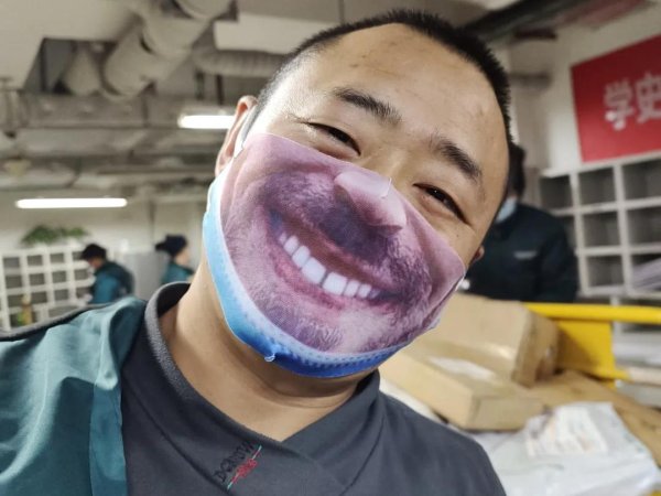 為了緩解“雙11”工作的疲憊狀態(tài),東四郵政支局投遞部的這名小伙子網(wǎng)購(gòu)了這個(gè)可愛的口罩,他說:“我們把微笑送出去,不讓自己疲憊的身影影響用戶!”