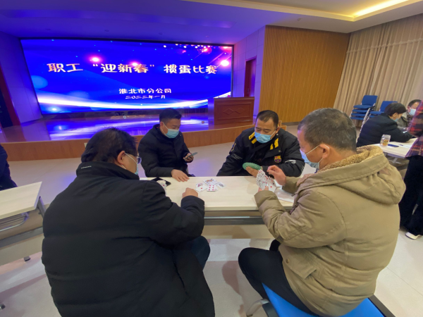 為喜迎虎年新春,豐富職工業余文化生活,緩解職工工作壓力,增強企業凝聚力,2022年1月12-13日,淮北市郵政工會組織開展了“迎新春”摜蛋比賽活動。本次比賽受到廣大職工的歡迎和踴躍報名,共有24對選手經過抽簽配對12桌同時進行比賽。 此次摜蛋比賽采取淘汰賽。比賽過程中,參賽選手們密切配合,沉著應戰,見招拆招。比賽現場選手和觀眾談笑風生,氛圍和諧愉快,賽事精彩紛呈。經過兩個晚上6輪的激烈角逐,最終決出冠亞軍季軍。