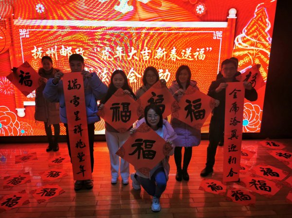 員工們拿著一幅幅寓意喜慶的春聯和“福”字,臉上洋溢著喜悅,整個現場被紅色的春聯和熱鬧的人群映襯得年味十足。(江西省郵政工會)