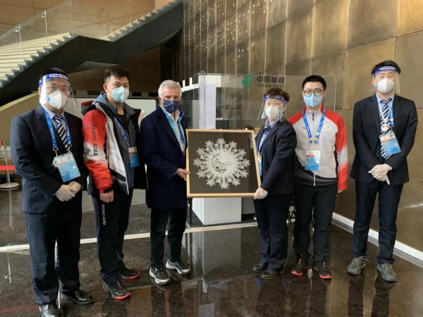 國際奧委會副主席胡安·安東尼奧·小薩馬蘭奇先生從北辰洲際酒店臨時郵局順利寄出包裹后,對郵政服務十分滿意,他親自來到網點向工作人員致謝,并送上“大美冬奧”主題剪紙藝術品。(北京郵政工會)