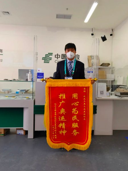 3月3日下午,延慶冬奧村臨時郵局尤志強收到了一位資深郵迷寄來的印有“用心為民服務、推廣奧運精神”的錦旗,字里行間洋溢著對尤志強滿滿的感激和沉甸甸的信賴。