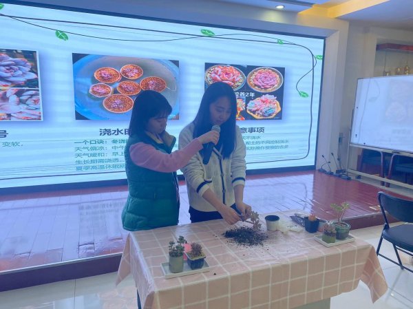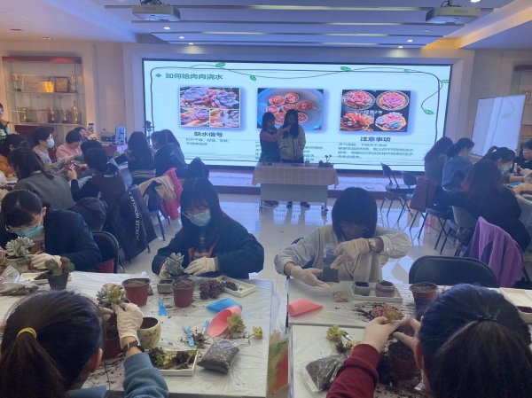 在為期一個多小時的時間里,授課老師對多肉種植和養(yǎng)護進行了全方位的講解和展示,讓在場女職工學(xué)會欣賞多肉,通過圖片不僅認識多肉,更從多肉的名稱引申至詩歌,如介紹玉露時,職工會了解到“金風(fēng)玉露一相逢,便勝卻人間無數(shù)”,不僅讓我們的女職工欣賞美,更能受到古典詩詞的熏陶,增強文化底蘊。之后進行了多肉的種植,淡雪、烏木、綠龜卵、桃美人、火狐貍、福娘,多種款式的多肉植物讓大家直觀的接觸并種植。