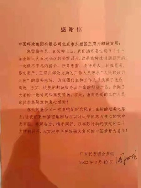 全國兩會期間,北京郵政各單位根據(jù)全國兩會總務(wù)組和中共北京市委、北京市人民政府的相關(guān)要求,明確分工、夯實責(zé)任,為代表委員提供了細致、周到的郵政服務(wù),并獲得一致好評;重慶代表團、遼寧代表團、海南代表團、甘肅代表團、湖南代表團、山西代表團、中國人民政治協(xié)商會議全國委員會辦公廳、政協(xié)全國委員會辦公廳、第十三屆全國人大第五次會議秘書處總務(wù)組等分別向北京郵政寄來感謝信,對全國兩會郵政通信服務(wù)工作給予充分肯定和衷心感謝。