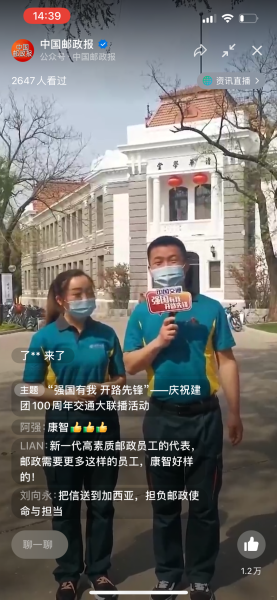 十大篇章、200多家全國優秀青年組織,展示逢山開路、遇水架橋的開路先鋒精神。來自北京郵政的優秀青年代表、中國郵政集團有限公司清華大學郵政支局康智,出現在第四篇章《堅守匠心》。“強國有我,開路先鋒” 交通運輸部“強國有我 開路先鋒 慶祝建團 100 周年交通大聯播活動” 受到網友熱情關注,400萬網友觀看了聯播活動。主播李敏和清華大學郵政支局營業部經理康智共同出鏡。