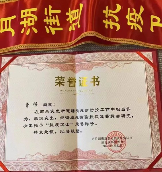 累計參與核酸檢測24輪;志愿服務時長超160小時。今年4月22日,他被南昌縣八月湖街道新冠肺炎疫情防控應急現場指揮部授予“抗疫衛士”榮譽稱號……他就是曹偉,江西省寄遞事業部快遞包裹部的一名共產黨員。自今年3月下旬南昌突發疫情以來,他主動報名參加轄區抗疫志愿者,用實際行動踐行郵政人的責任擔當。