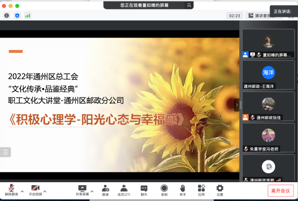 6月13日,通州區郵政分公司工會積極落實疫情防控要求,借助通州總工會“文化傳承.品鑒經典”職工文化大講堂活動,由承辦方朱熹學堂邀請心理專家董如峰老師為全公司50余名全體支行長及職工心理志愿者組織線上第二期心理解壓講座。