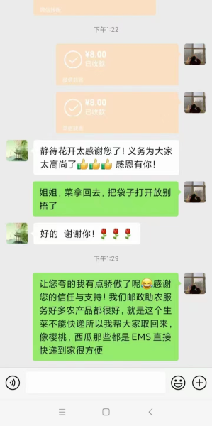 “這水果和菜真新鮮,可比旁邊小店里的看著好,你是從哪里買到的?”何軍的“郵政團長”正是從這一句開始的。一開始,何軍以嘗試的心態(tài)在郵樂優(yōu)鮮訂購了幾次蔬菜和水果,而就在在小區(qū)門口拆包裝驗貨時,有鄰居路過看到菜品質(zhì)量非常好,上前詢問購買渠道,就從這一聲聲詢問開始,何軍耐心細致地介紹郵政保供服務(wù),對鄰居們提出的訂購問題進行逐一解答,并介紹了蔬菜禮包、西瓜等產(chǎn)品發(fā)貨快、新鮮的特點。在他的介紹和推薦下,鄰居們紛紛嘗試下單,并在體驗后對郵政服務(wù)和郵政蔬菜的品質(zhì)贊不絕口。很快何軍和郵樂優(yōu)鮮便在小區(qū)居民中“火爆”了,周邊更多的小區(qū)居民也開始參與到線上訂購的隊伍里。為了更好地服務(wù)鄰居們訂購蔬菜,何軍更建立起了“郵政團購”服務(wù)群,及時關(guān)注每一位居民訂購的情況,發(fā)現(xiàn)問題第一時間解決,以優(yōu)質(zhì)的服務(wù)感動了小區(qū)的居民。