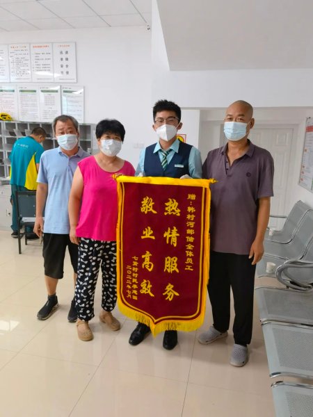 “誤會”澄清后,老人萬分感激柜員曹浩的細心幫助,證明了自己存折里的錢并不是“丟了”,并和當班大堂經理熱情得聊起存款的點滴,直至老人的兒女趕來,當班大堂經理一直貼心得陪伴在老人身邊聊著“存錢那點事兒”…… 事后,老人兒女紛紛表示,隨著老人年邁,記憶力也減退了,同時老人又有高血壓、心臟病等老年基礎病癥。當他們剛接到電話,聽到老人這次獨自面對的“存折風波”,真是心驚又肉跳,既擔心老人情緒激動引發身體狀況,又顧慮老人獨身在外沒個照應……沒想到的是,韓村河郵政網點員工素質高、能力強,很快就幫老人將資產明細梳理的清清楚楚,撫平了老人的誤解與疑慮,而且服務態度始終貼心而溫暖,就連老人回家后都不住的口口稱贊:郵局小伙人好,心細、干活麻利又專業呢!老人家屬為表感謝,贈予韓村河全體員工錦旗。