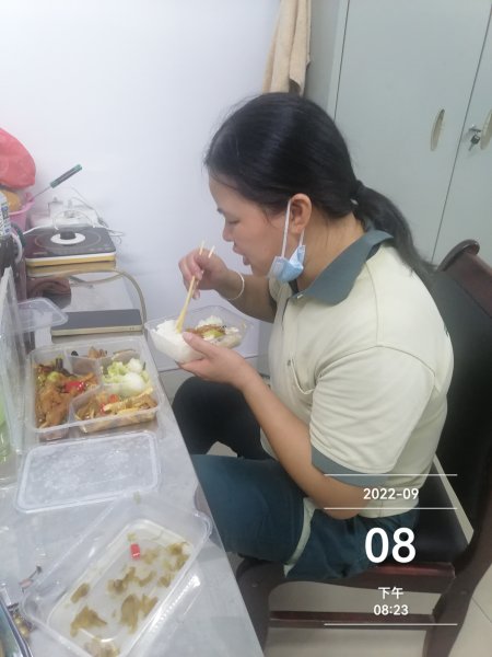 處理完站前投遞部的事情后,朱翠美又馬不停蹄的來到水南營業部,協助攬投員卸車、稽核掃描、郵件分揀、掃描下段、郵件裝袋等。中心局也因大部分員工居家靜默管理,進口郵件因缺人不能及時處理,造成網運趟車不能按正常時間、頻次發車,疫情期間所有攬投部經理必須24小時在攬投部值班,隨時在崗待命接卸郵件。9月8日,疫情封控第二天,水南營業部郵件分揀下段工作完成后已是晚上8點多鐘了,這時饑腸轆轆的朱翠美才抽空吃上飯菜早已冰涼的盒飯。