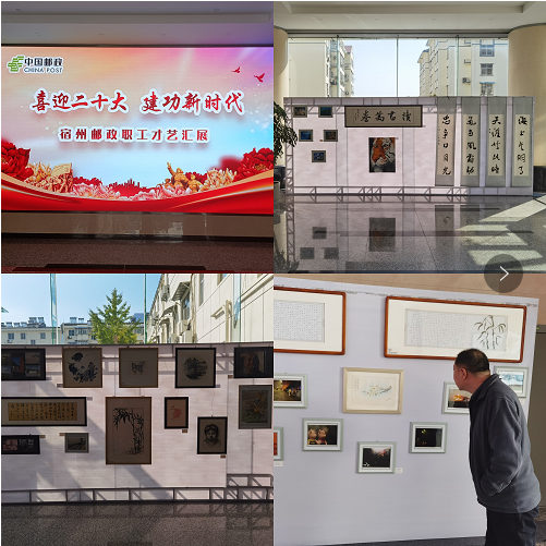 10月13日,宿州郵政工會在市分公司大樓一樓大廳舉辦了為期10天的“喜迎二十大 建功新時代 ”才藝會展活動,本次活動共征集到書法作品12件、繪畫作品10件、攝影作品30余件、手工作品3件。職工們進出大樓時紛紛駐足觀看在感受藝術之美的同時,紛紛感嘆郵政職工人才濟濟。