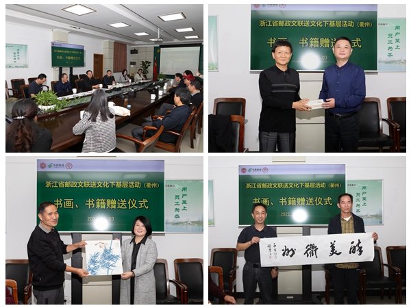 省郵政文聯的會員們為衢州市分公司帶來翰墨丹青、書籍作品,并在現場開展創作活動,揮毫書寫新時代衢州郵政精神,潑墨渲染衢州郵政風貌,為衢州市、縣各分公司贈送一幅幅生動的書畫作品,衢州市分公司總經理俞亮接受了省郵政文聯的捐贈。