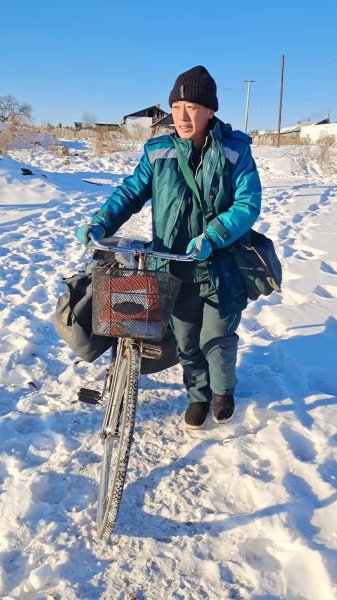 他就是中國郵政集團有限公司黑龍江省呼瑪縣分公司北疆支局鄉郵員韓幫緒,1989年9月他進入北疆鄉郵電所工作,從此開始了他的綠衣使者生涯,1998年郵電分營后,原來的郵電所變成了郵政支局,他一個人、一條路、一個支局在這里一干就是三十幾年。由于北疆鄉地處山區,道路崎嶇,投遞線路長,投遞累計總長度達120多公里,經常是早上騎車出門,到了傍晚才回家。餓了,就著咸菜嚼口干糧;渴了,在河邊舀瓢涼水喝。夏天,天氣酷熱難耐,遇到下雨天,道路泥濘,為了不淋濕郵袋里的信件,他就用塑料布把郵袋包好,自己被雨淋濕,感冒發燒是常有的事。一次他騎自行車投遞時不小心摔傷,頭上縫了5針,簡單處理了傷口就又繼續工作,現在頭上還留著一塊傷疤。冬天,這里最低氣溫達到零下40度以上,寒風打在臉上像刀子割一樣,雪大路滑,沒法騎自行車,只能推著自行車投遞,每次回家,身上都會上一層霜。就是在這樣艱苦的環境下,他沒有一句怨言,他始終告訴自己,一定要將郵件準確送到每個用戶手中,因為對于鄉親們來說,這不僅僅是一個包裹、一份報紙,更是他們與外界連接的橋梁。三十三年的投遞生涯,他已經把這份工作當成自己生命中不可缺少的一部分,三十三年的青春年華,已經全部獻給了郵政事業,三十三年的跋涉與堅守,換來的是大家對他的那份信任與期盼。