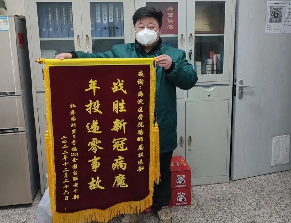 近日,海淀區學院路投遞部收到牡丹北里全國臺聯老干部中心章先生親自送來的一面錦旗,上面寫著“戰勝新冠病魔 年投遞零事故”。章先生將錦旗交到學院路投遞部副主任李國峰手中,并對他表示了感謝。