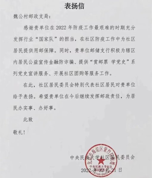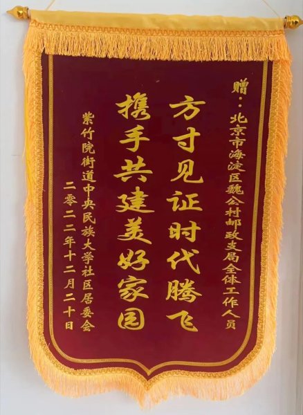 去年,魏公村郵政支局和中央民族大學支行積極助力民大社區建設各項工作,與社區聯合開展了“賞郵票 學黨史”系列宣講、線上社區團購、愛老助老等豐富多彩的活動。尤其是特殊時期,魏公村郵政支局的工作人員逆行而上、堅守崗位,以實際行動全力以赴服務社區保供保通保暢,得到社區居民的一致肯定和社區工作人員的高度認可。為表達感謝之情,新年伊始,中央民族大學社區居民委員會主任及工作人員專門為魏公村郵政支局送來了錦旗和表揚信,錦旗內容為“方寸見證時代騰飛,攜手共建美好家園”,意為社區與郵政攜手奮進,共同為民服務、踐行使命。